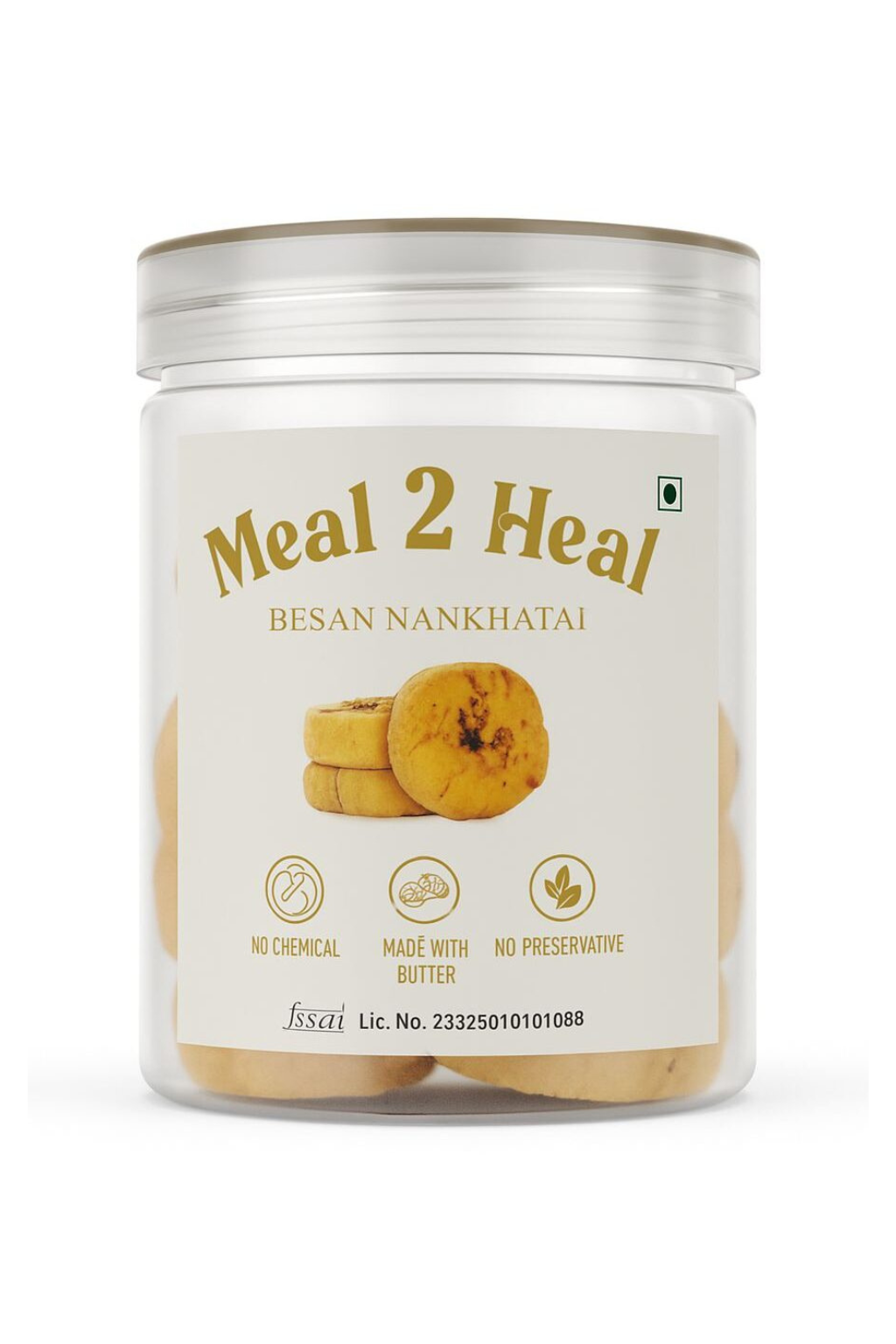 Meal2Heal Besan Nankhatai brings you the richness of Indian shortbread in its purest, healthiest form. Made using roasted gram flour (besan), jaggery powder, and cold-pressed oil, these melt-in-your-mouth cookies are full of flavor, texture, and nostalgia — minus the maida, refined sugar, or artificial additives.