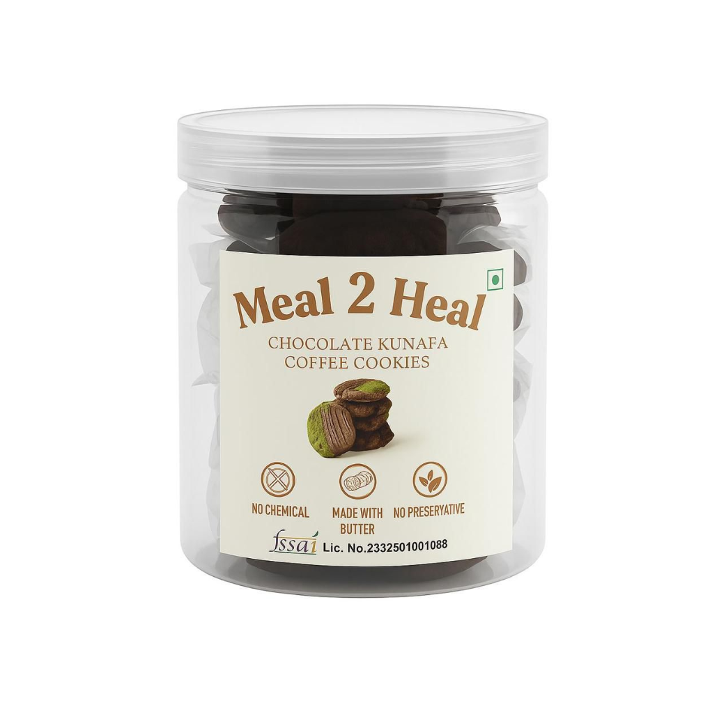 Introducing Meal2Heal Chocolate Kunafa Coffee Cookies — a handcrafted, indulgent cookie that brings together the richness of dark chocolate, the aroma of slow-brewed coffee, and the signature crunch of golden-baked kunafa vermicelli.