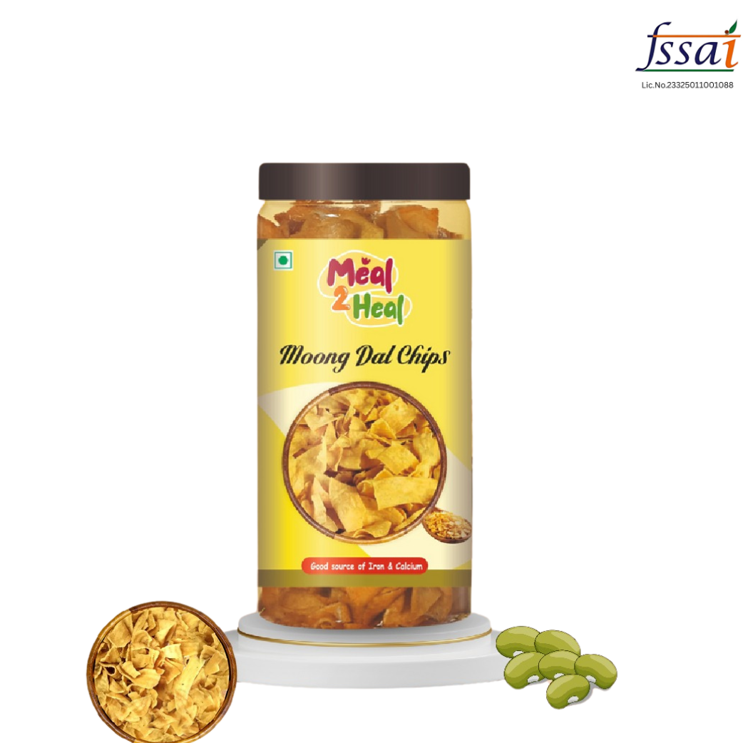 Meal2Heal Moong Dal Chips are made from a nourishing blend of moong dal flour, brown rice, and natural spices—creating a light yet crispy chip that delivers on both taste and nutrition. High in plant-based protein and dietary fiber, these chips are a healthier alternative to conventional fried snacks.