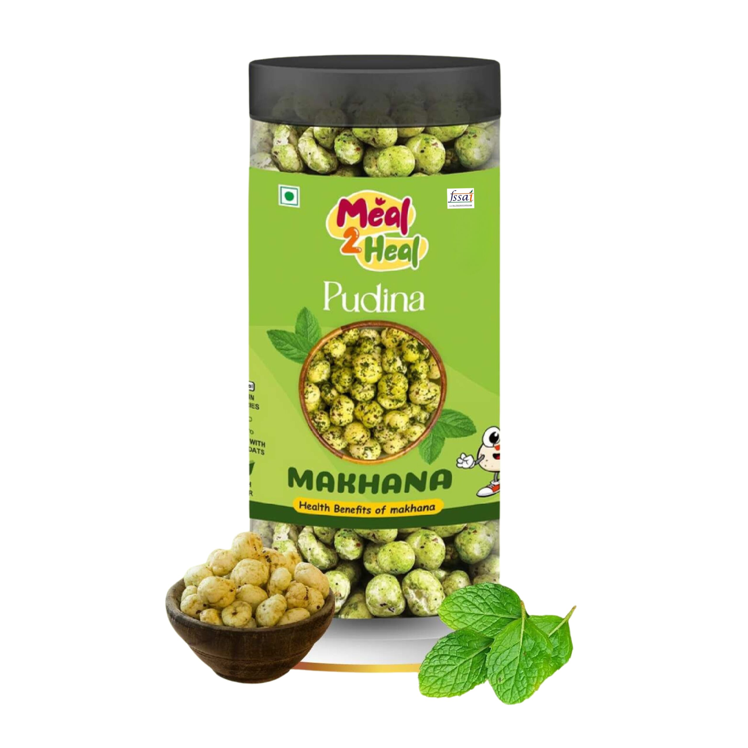 Experience the cool, herby delight of Meal2Heal Pudina Hand Picked Phool Makhana, a crunchy snack seasoned with aromatic pudina (mint) and flavorful Indian spices. These air-popped foxnuts are roasted, not fried, making them a wholesome alternative to traditional namkeens and chips.